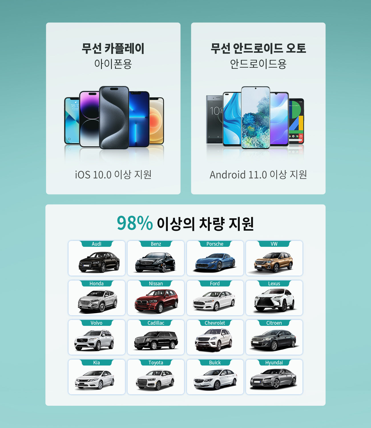2016년 이후 출시된 차량 중, 순정 유선 CarPlay 또는 유선 Android Auto 기능이 탑재된 모델에서 사용 가능합니다.