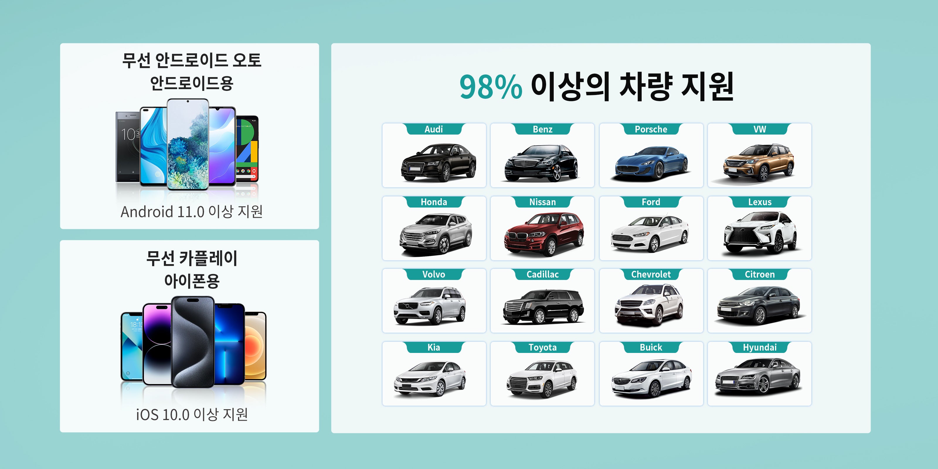 이제는 케이블 없이! 무선 CarPlay와 Android Auto를 손쉽게 즐기세요.